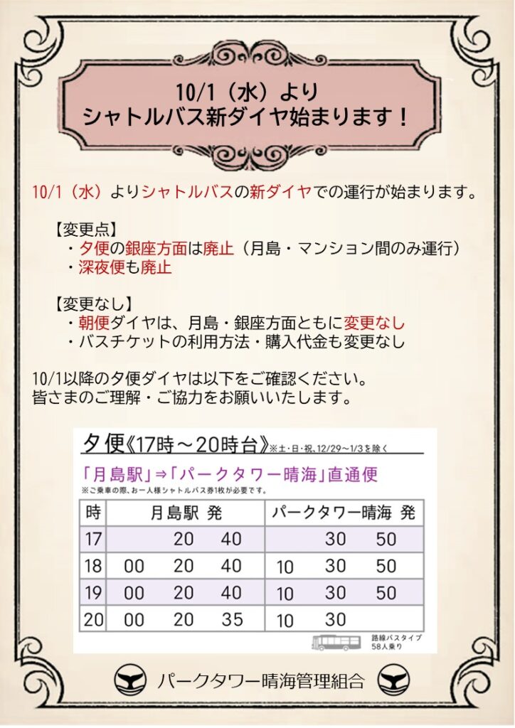 管理組合の負担・チケット代金を据え置きながらも、居住者の皆さまがより快適に毎日を過ごせるよう工夫した今回のダイヤ改正。インフレで様々な価格が高騰する中にあっても、費用を従前と同額に抑えつつ実現した利便性向上を、ぜひ日々の生活の中で実感していただければ幸いです。