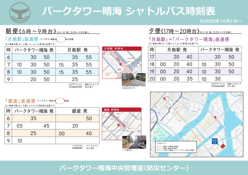 銀座・新橋方面からはすでに有楽町線・大江戸線といった鉄道に加え、都営バスや東京BRT等の公共交通機関が多数運行されており、代替手段が豊富にあります。そのため、マンションのシャトルバスとしては「公共交通では代替が難しい区間 = マンションと月島駅間」に役割を集中させることがより居住者の利便性に資すると判断しました。