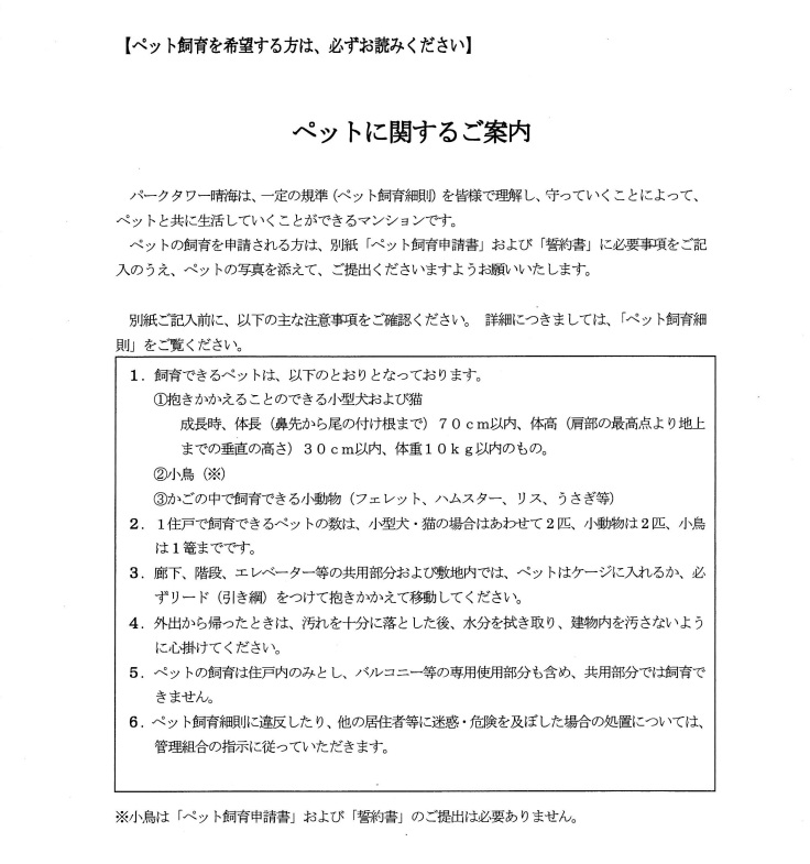 ▼パークタワー晴海 ペットに関するご案内